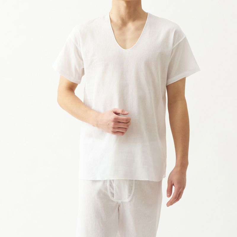 三つ桃クレープ 綿80% 麻20% U首半袖シャツ M・L